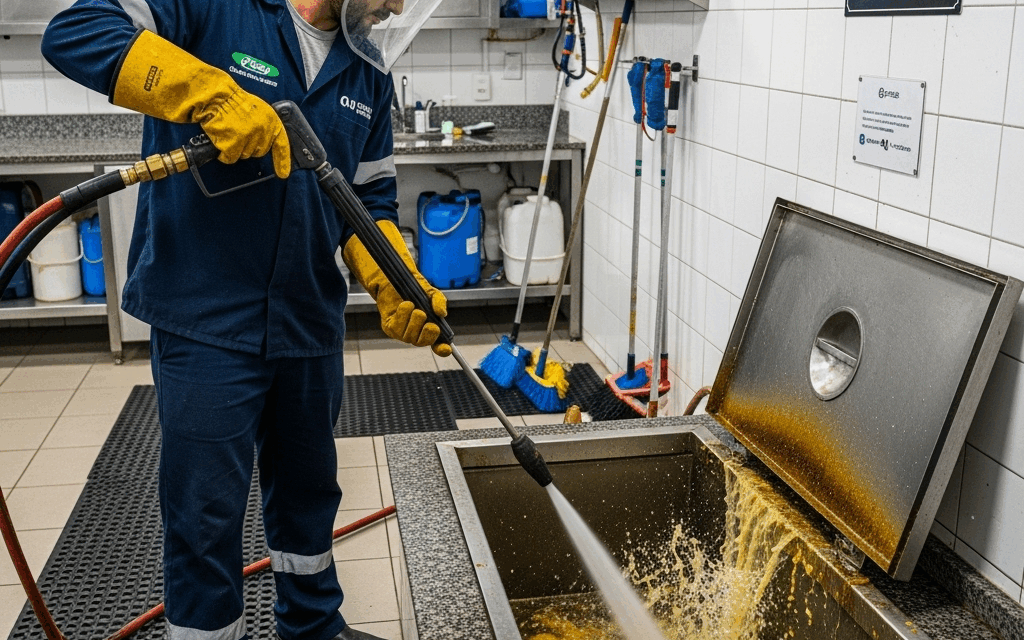 Limpeza de caixa de gordura: essencial para evitar refluxos e mau cheiro em cozinhas residenciais ou industriais.